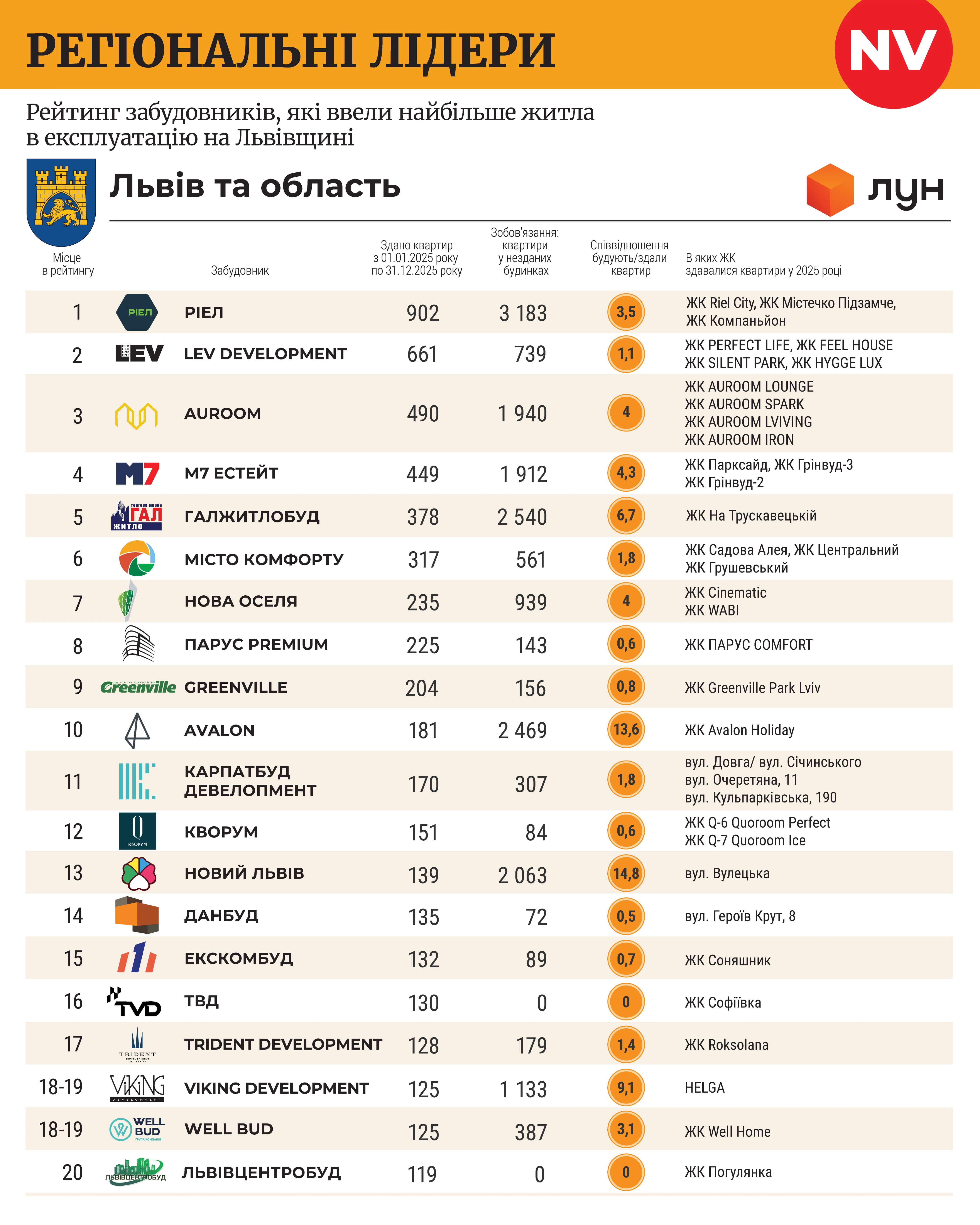 У Львові та області РІЕЛ вдруге поспіль очолив рейтинг — 902 здані квартири у 2025-му проти 1 418 у 2024-му. Попри менший показник у абсолютних цифрах, компанія зберегла лідерство з відривом і має найбільший портфель об'єктів у регіоні — 3 183 квартири. Avalon також представлений у топі із значним портфелем будівництва.
